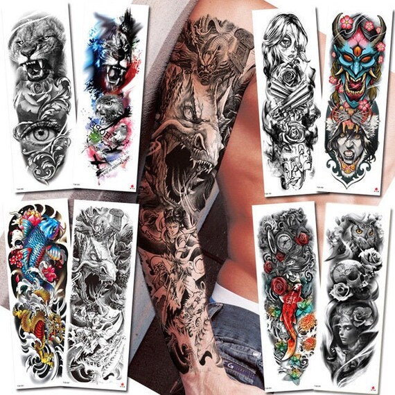8 Sheets Large Men Temporary Tattoo Women Fake Tattoo Sleeve Full Arm Temporary Tattoo Sticker New Dragon Fish Skull Lion Party Tattoo